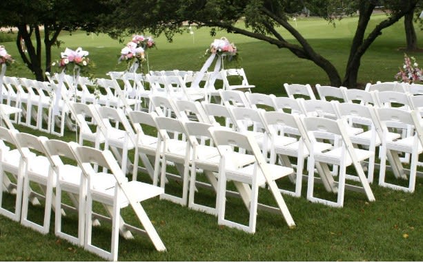 The White Resin Folding Chair with padded seat combines comfort and elegance that looks good at all your special events, whether it's a backyard barbeque, a formal banquet or wedding. This chair is made from ultra-strong resin that's very lightweight, yet extremely strong and can hold up to 1000 pounds making this portable folding chair perfect for any social event. Width: 17" Depth: 18" Height: 31"