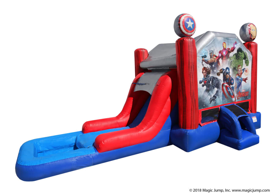 Assemble with Earth’s Mightiest Heroes with AVENGERS Combo Wet or Dry (Pool Removed). Heroes bounce and cool off at the same time, play basketball, or climb and slide into the pool for a feel of a water park at the convenience of your own home. It is a bounce house waterslide combo inflatable that features a special non-slip material for safe use with water. The AVENGERS combo is designed with digital artwork “Captain America” Shield and “Iron Man” Helmet embellishments on top of the front vertical pillars.