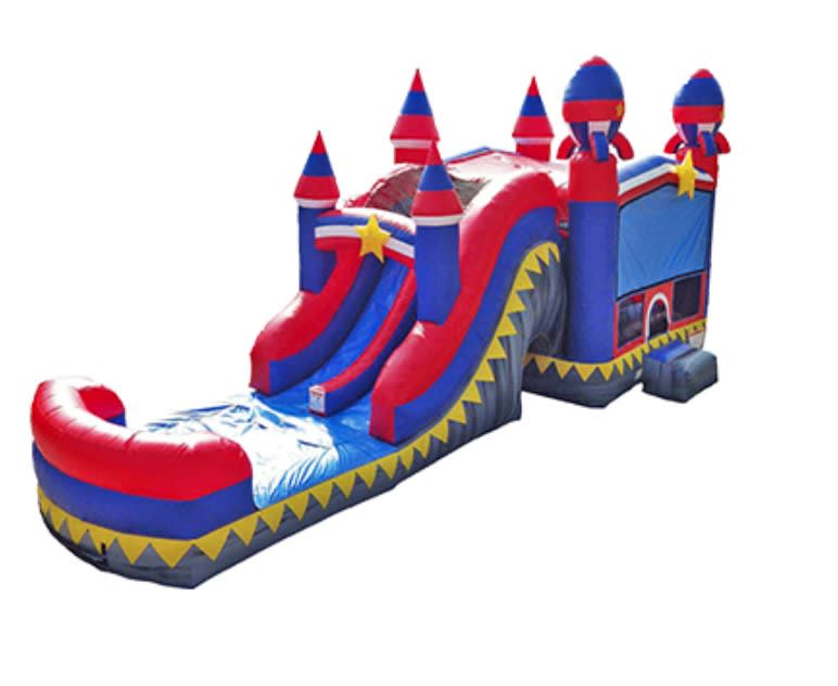 The Rocket Dual Lane (7 In 1) Combo is ready for blastoff! This Wet or Dry 2-Lane combo features seven different activities: (1) a bouncing area; (2) a basketball hoop; (3) inflated push-through/ obstacle pop-ups; (4) a wall climber; (5) an 8ft "high platform" wet or dry slide; (6) a pool/landing for wet use and (7) tunnel for kids to run and play. Two Riders can slide down safely in their own lane with an inflated landing at the end of the slide that makes for hours of great fun! This is a larger Combo Set great for kids of all ages.